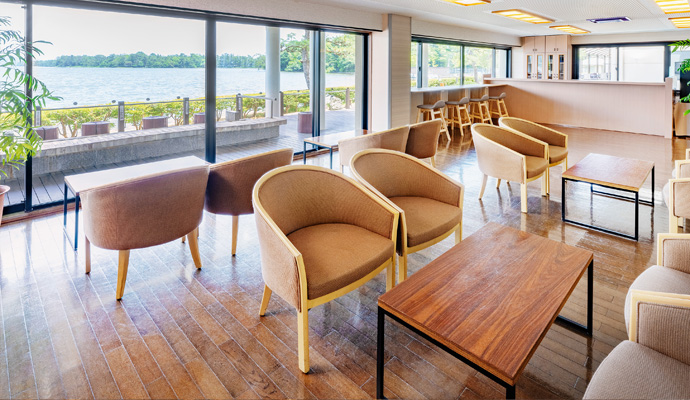 陽光降り注ぐ海辺のロビー。日本三景・天橋立がお客様をお迎えいたします。